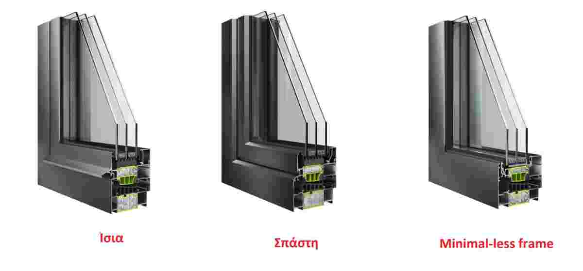 - Νέα σχεδιασμένα προφίλ για πόρτες εισόδου και κουζινόπορτες με δυνατότητα χρήσης κινητού ανεμοφράκτη ή χρήσης χαμηλών κατωκασιών τα οποία αυξάνουν την υδατοστεγανότητα της πόρτας στο κάτω μέρος (τοποθέτηση ελαστικών – λάστιχων).