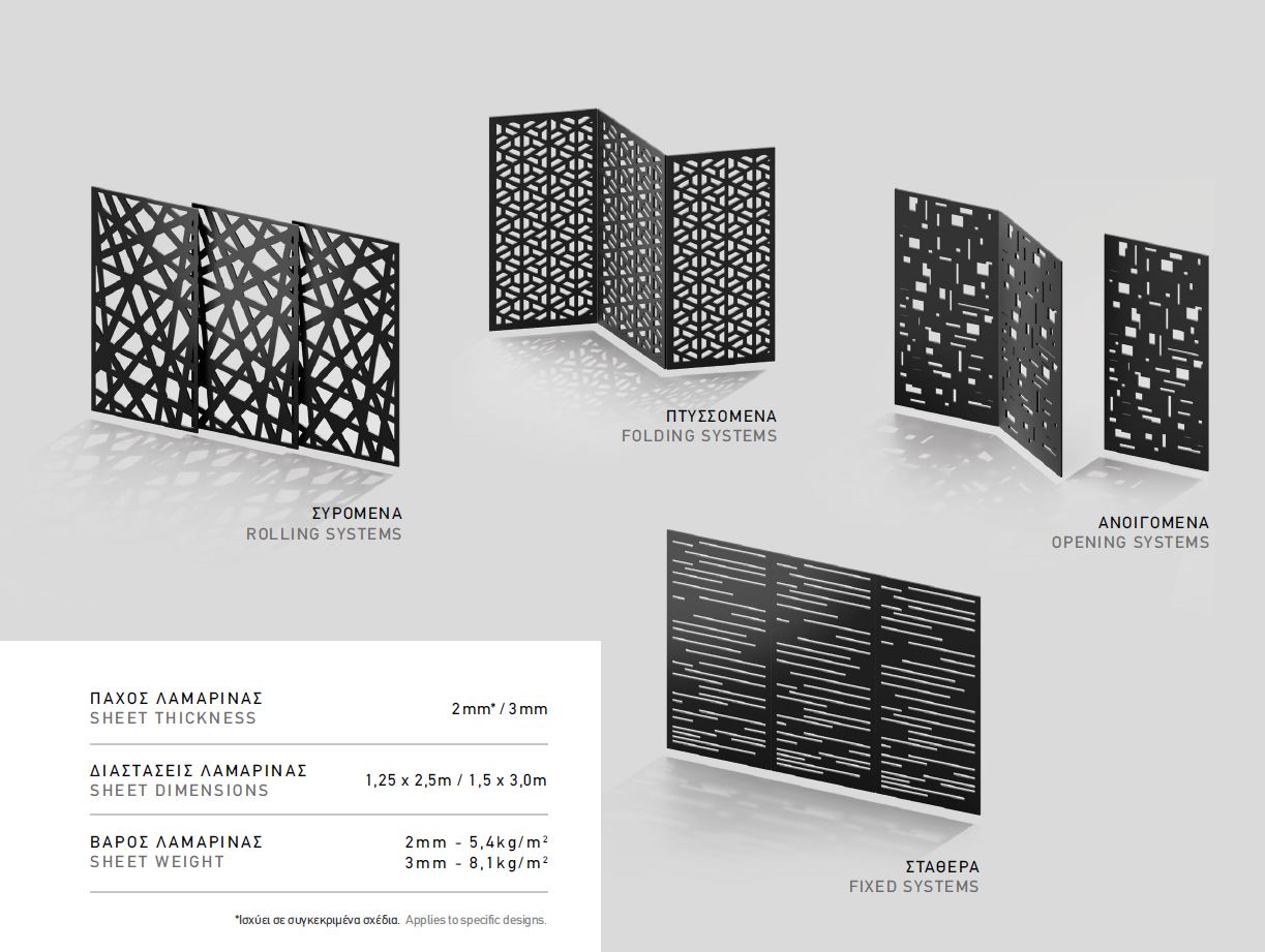 H Europa καινοτομεί με το νέο σύστημα Europa element. Το νέο σύστημα Element της Europa είναι φύλλα αλουμινίου μεγάλων διαστάσεων, που διατίθενται σε διαφορά σχέδια (σχέδια Europa element) και χρησιμοποιούνται ως συστήματα σκίασης (αντί ρολών η πατζουριών )  ή σαν διαχωριστικά εξωτερικών και εσωτερικών χώρων (οικίες, καταστήματα εστίασης κλπ.). Το Element είναι ένα καινοτόμο και πρωτοποριακό αρχιτεκτονικό σύστημα, υψηλής αισθητικής και σχεδίασης, που αποτελεί ιδανική επιλογή για κάλυψη χώρων, σκίαση, ηχομόνωση και το διαχωρισμό εσωτερικών και εξωτερικών χώρων. Κατασκευάζεται από κράμα αλουμινίου, ένα υλικό φιλικό προς το περιβάλλον, που συνδυάζει μεγάλη αντοχή στο χρόνο και υψηλή ενεργειακή απόδοση. Μπορεί να χρησιμοποιηθεί είτε σαν σταθερό στοιχείο, είτε σαν συρόμενο (συρόμενο κούφωμα), πτυσσόμενο (φυσσούνα) ή ανοιγόμενο κούφωμα, με την βοήθεια του συστήματος Ew -40. To Element διατίθεται σε ποικιλία σχεδίων (σχέδια Element) ενώ υπάρχει δυνατότητα δημιουργίας του σχεδίου της επιλογής σας – custom made (δείτε στις φωτογραφίες όλα τα τυποποιημένα σχέδια του Europa Element). Το σύστημα μπορεί να διατεθεί σε οποιοδήποτε χρώμα από τα χρώματα κουφωμάτων Europa ( δείτε όλα τα χρώματα κουφωμάτων Europa ).