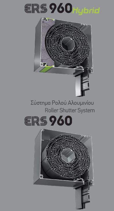 - Διατίθεται σε δύο εκδόσεις κουτιών, το ERS 960 Hybrid κουτί με θερμοδιακοπή και πρόσθετη θερμομόνωση NEOCOAT EPS και στο απλό κουτί ERS 960, ενώ τα ρολά αυτά μπορούν να τοποθετηθούν είτε επικαθήμενα , είτε εξωτερικά.